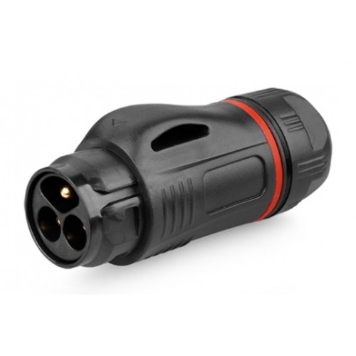 The connector is characterized by high resistance to dust and moisture (protection according to the IP67 standard), which makes it suitable for use in difficult conditions. The housing material is durable, ensuring durability and protection from mechanical damage. The connector has a three-point connection design, which allows for easy and quick connection. The contacts are made of high-quality copper alloy.