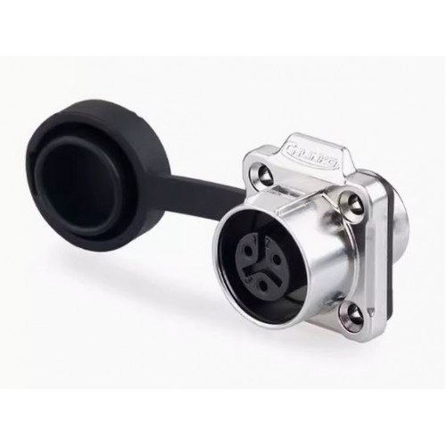 Sealed power connector LP series - LP-12-J03SX-03-401 - 3-pin sealed panel socket in a metal case series LP with direct cable output 24AWG. The connector has a bore diameter - 12 mm, connects circuits with a current of 5A and a voltage of 150V