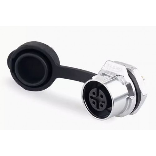Sealed power connector LP series - LP-12-J04SX-03-101 - 4-pin sealed panel socket with mounting on nut in a metal case of the LP series with a direct cable outlet 24AWG. The connector has a bore diameter - 12 mm, connects circuits with a current of 5A and a voltage of 150V