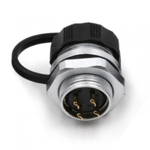 Connector WF16J4ZM1 - four-pin sealed panel plug with direct cable outlet. It has a mounting diameter of 16 mm, connects a circuit with a current of up to 5A and a voltage of up to 500V, the wires are fastened by soldering. Degree of protection - IP67.