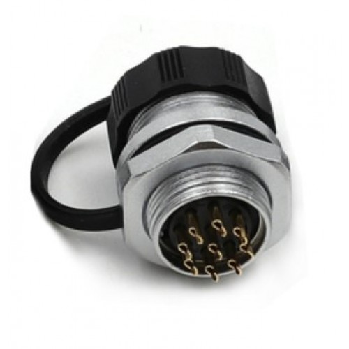 Connector WF16J9ZM1 - nine-pin sealed panel plug with direct cable outlet. It has a mounting diameter of 16 mm, connects a circuit with a current of up to 5A and a voltage of up to 400V, the wires are fastened by soldering. Degree of protection - IP67.
