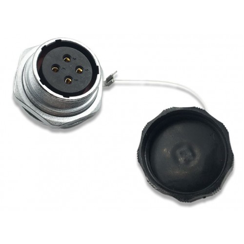 Connector WF20K4ZMQ1 - four-pin sealed panel socket with direct cable outlet. It has a mounting diameter of 20 mm, connects a circuit with a current of up to 25A and a voltage of up to 500V, the wires are fastened by soldering.