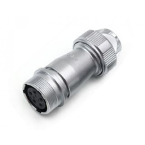 Connector WF20K7ZEB1 - seven-pin sealed cable (can be used as an inter-cable) socket with a direct cable outlet and a metal clamp. It has a mounting diameter of 20 mm, connects a circuit with a current of up to 10A and a voltage of up to 500V, the wires are fastened by soldering.
