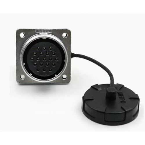 Connector WF32K13Z1 - nineteen-pin sealed panel socket with direct cable outlet. It has a mounting diameter of 32 mm, connects a circuit with current up to 10A and voltage up to 500V, The wires are fastened by soldering.