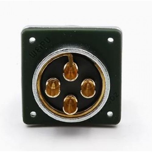 Connector WF32K4Z1 - four-pin sealed panel socket with direct cable outlet. It has a mounting diameter of 32 mm, connects a circuit with a current of up to 50A and a voltage of up to 500V, the wires are fastened by soldering.