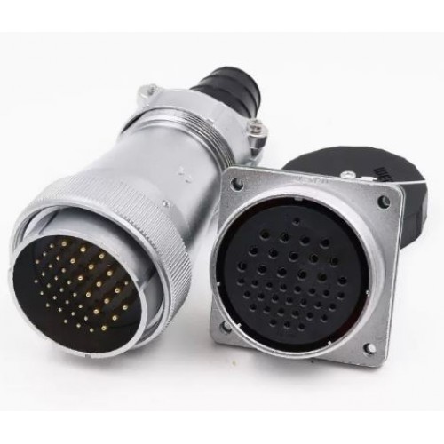 Connector WF55K40Z1 - forty-pin sealed panel socket with direct cable outlet. It has a nominal mounting diameter of 55 mm, connects a circuit with a current of up to 25A and 10A and a voltage of up to 500V, the wires are fastened by soldering.