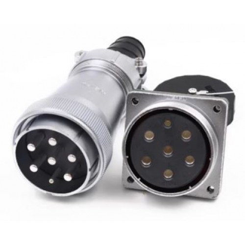 Connector WF55K7Z3 - seven-pin sealed panel socket with direct cable outlet. It has a nominal mounting diameter of 55 mm, connects a circuit with a current of up to 100A and 50A and a voltage of up to 500V, the wires are fastened by crimping.